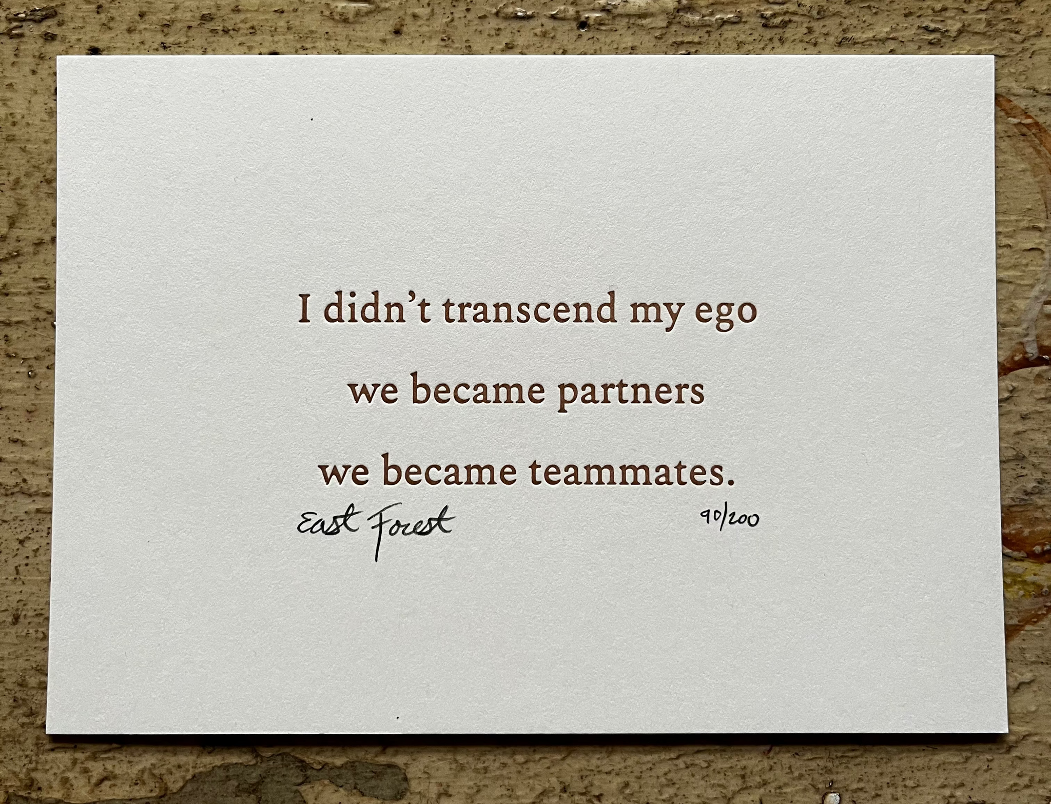 These signed and numbered letterpress prints feature a quote from East Forest's song 'grandmothersphere'. Looks great in a frame for your office, home or anywhere you'd like a boost of inspiration.